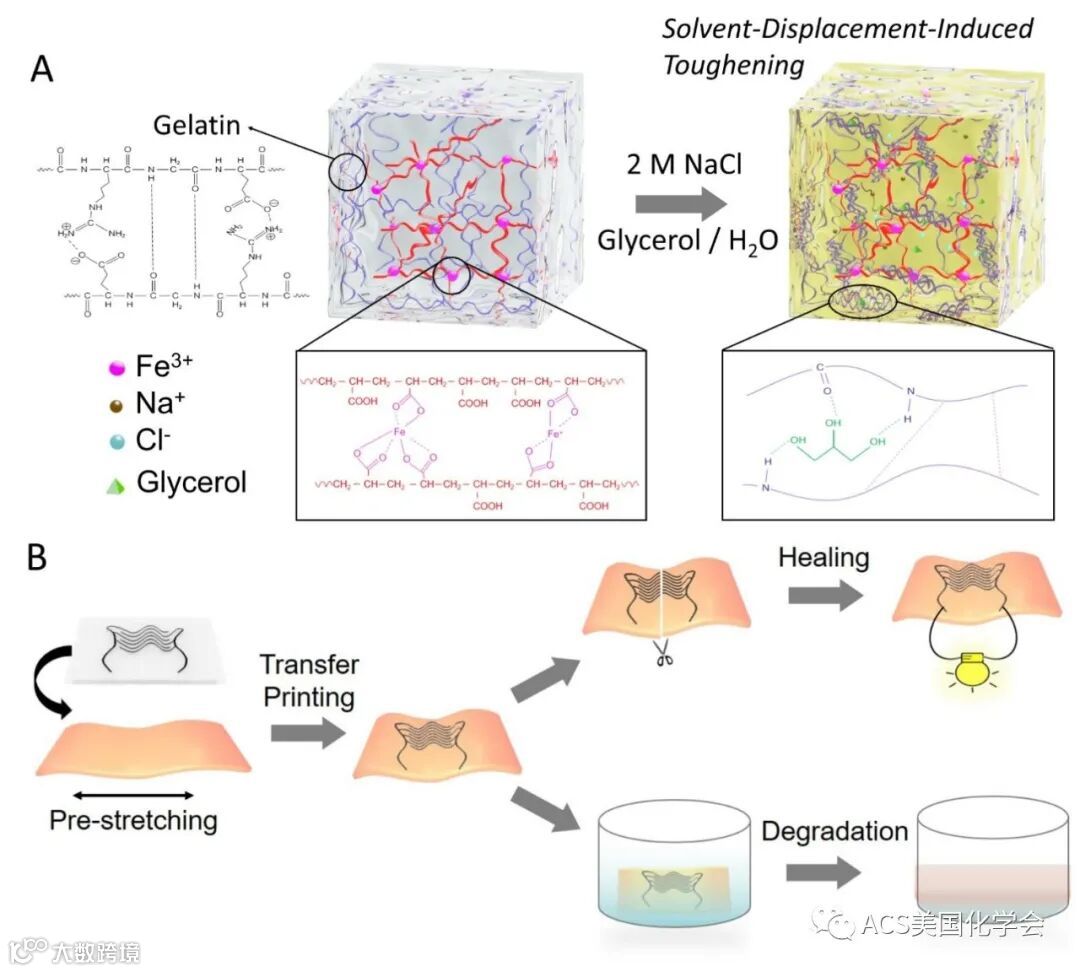 图1. (A)溶剂置换增韧的明胶/聚丙烯酸-甘油(GEL/PAA-GL)有机水凝胶电解质示意图;(B)可拉伸、可自修复、可降解的碳基微器件制备示意图。