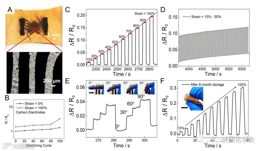 图3. 以GEL/PAA-GL凝胶电解质制备的微型压阻式应变传感器性能展示。