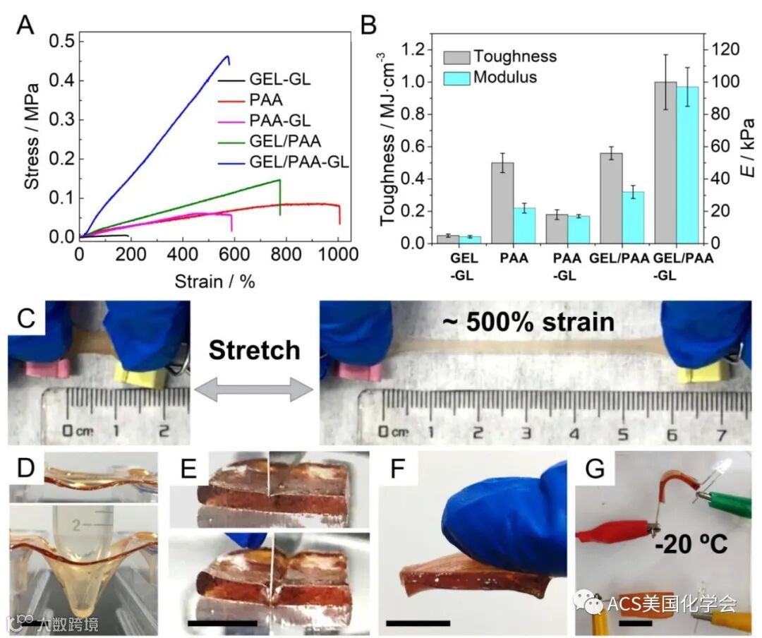 图2. GEL/PAA-GL水凝胶可拉伸、抗变形、抗剪切、可粘附、抗冻、自修复等性能展示。
