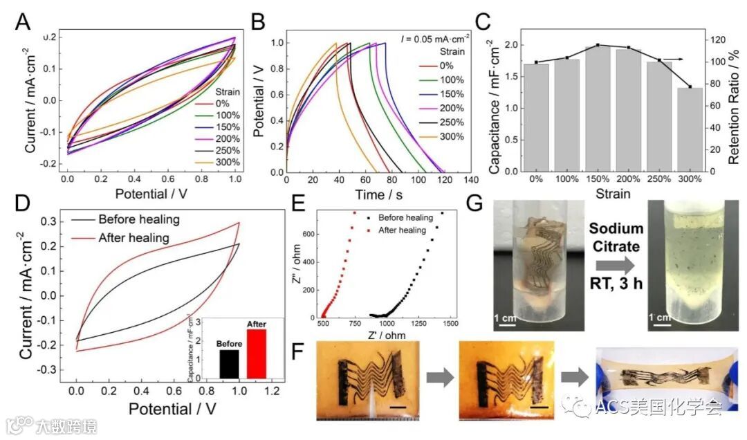 进一步,以GEL/PAA-GL有机水凝胶为电解质及支撑基底,结合可拉伸碳基微型电极的印刷,实现了多功能微型器件(压阻式应变传感器、超级电容器)的概念验证与性能展示。这些器件展现了优异的性能,包括①柔韧性,预拉伸200%,器件拉伸至300%仍可保持80%的电容容量。②自修复,自修复后仍可实现可拉伸性和电学性能。③可降解,3小时内器件可在柠檬酸钠溶液中室温降解。④长期稳定,器件在6个月后仍能保持一定的柔韧性和压阻传感性能。