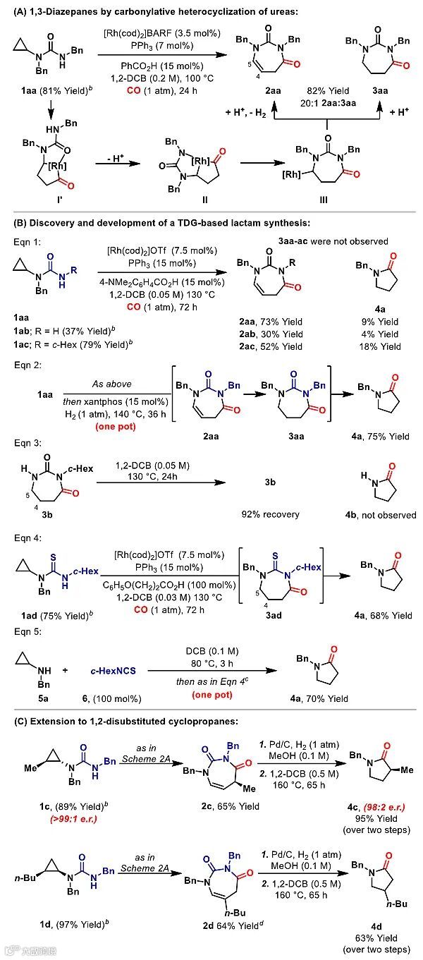 John F. Bower教授课题组证明了简单易得的异(硫)氰酸酯可以作为氨基环丙烷C-C键活化羰基化过程中的临时导向基,从而可以利用该方法直接制备复杂的γ-内酰胺。该反应以不寻常的缩环过程为基础,并通过了解其关键的机理特征,开发出利用经典反应性或关键的铑杂环戊酮中间体的串联过程。这些研究不仅证实了基于TDG的C-C键活化策略,也是首个不利用羰基缩合和亚胺水解进行TDG安装和脱除的策略。
