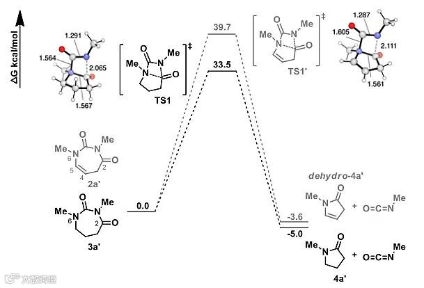 鉴于3到4的缩环不同寻常,因此作者使用简化体系3a'对该过程进行了DFT计算(图3),结果揭示了一种能量上可行的协同途径,即N6进攻C2并断裂C2-N1键,从而释放出异氰酸甲酯(ΔG‡= 33.5 kcal mol-1),其中N6中心的亲核性是关键,而不饱和体系2a'由于烯烃可能会降低氮孤对电子的亲核性,使得缩环过程具有更高的势垒(ΔG‡= 39.7 kcal mol-1)。该结果与以下观察结果一致,即2aa不经历缩环生成dehydro-4a(或4a)。相反,更常规的逐步加成消除机理(通过四面体中间体进行)在能量上则是不利的。