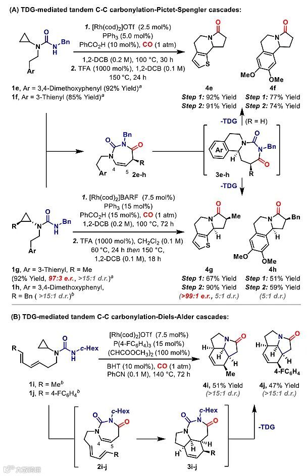 由于目前的研究表明缩环仅在C4-C5饱和的diazepanes中发生,因此作者将脲1e和1f置于羰基杂环化条件下,分别以92%和77%的收率生成2e和2f(图4A),接着将这些产物在高温下置于TFA中,会产生类似Pictet-Spengler的环化反应,从而消除了C4-C5的不饱和键并引发了缩环,得到三环内酰胺4e和4f。另外,作者还进行了一锅法,即在1e/1f完全消耗后直接添加TFA,分别以70%和37%的收率得到4e和4f,而无需分离2e/2f。双取代的环丙烷1g和1h也能以良好的非对映选择性和区域选择性得到目标4g和4h,且在1g反应的过程中手性保持。值得一提的是,二烯基体系1i和1j在140 °C的羰基杂环化条件下也能实现这一转化,分别以51%和47%的收率得到极具挑战性的三环体系4i和4j,并且是单一的非对映异构体(图4B)。在该反应过程中,最初经Rh-催化的环化反应得到的2i/2j可能是经热促进的Diels-Alder环加成反应得到加合物3i和3j,因此缩环可以自发进行,从而得到目标产物。并且反应最好是添加富马酸二甲酯。此外,BHT被用作添加剂来抑制反应过程中二烯底物的自由基聚合。