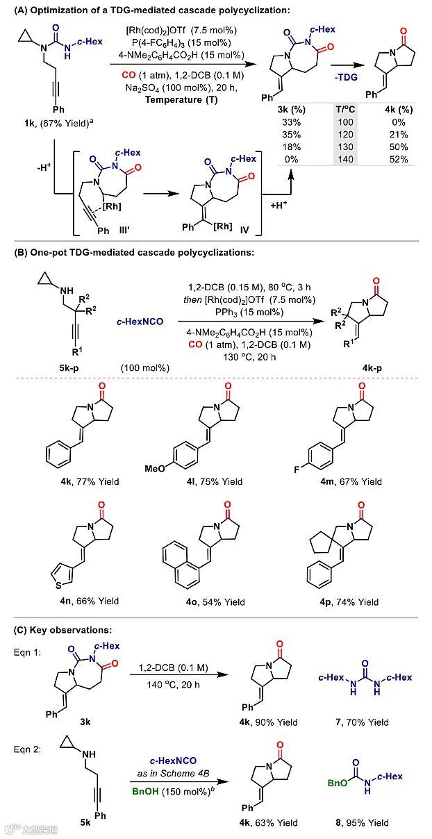 为了进一步扩展TDG策略的范围,作者考察了1k的羰基化环化(图5A),最初生成的烷基-Rh(I)物种III'在质子脱金属化前经syn-立体特异性的碳金属化得到3k。因此,铑杂环戊酮充当了一个双功能单元,其亲电性促进了第一次环化,随后的烷基-Rh(I)物种III'的亲核性则促进了第二次环化。当反应在100 ℃下进行时,仅观察到3k。但是,当温度升高至140 °C,仅观察到内酰胺4k,从而证实了缩环过程需要高温。此外,在添加羰基杂环化/缩环过程所需的组分之前,将胺5k与异氰酸环己酯预混合,并将配体改为PPh3,最终以77%的收率得到加合物4k(图5B),且能耐受一系列不同的炔烃,以54-77%的收率得到目标产物4l-4p。为了证实该过程的机理,作者分离出二氮杂环庚烷3k并在140 °C下加热,正如预期的一样,以90%的收率得到缩环产物4k,同时也分离出一种副产物——脲7。随后,作者将5k在苄醇存在的情况下进行反应,以95%的收率分离出氨基甲酸酯8,这一结果与异氰酸环己酯的释放一致。