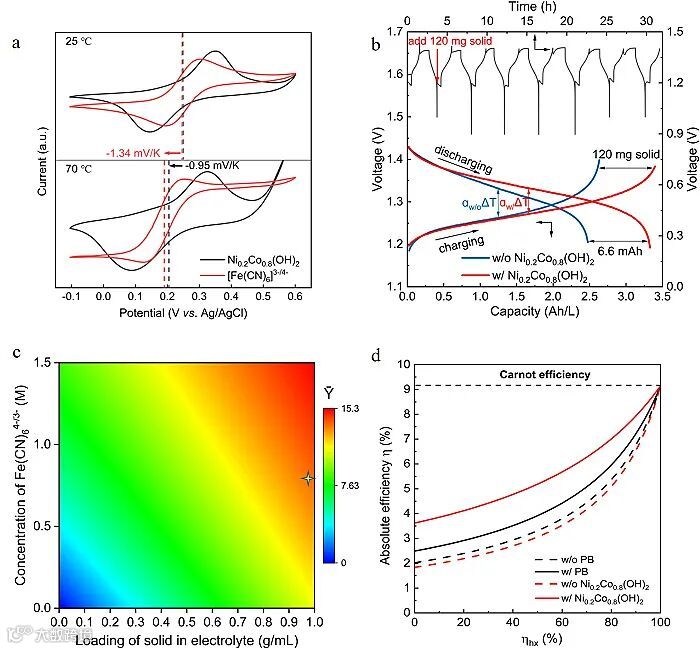 不同于传统的静态电池和液流电池只在每个电极上发生一个电化学反应,RT-FB中的氧化还原媒介分子[Fe(CN)6]3-/4-会先在电极上发生电化学反应,反应后再与储能罐中的高比容量的固体储能材料(Ni0.2Co0.8OH)发生化学反应。由于Fe(CN)63-/4-和Ni0.2Co0.8OH有相同的电位,[Fe(CN)6]3-/4-和Ni0.2Co0.8OH可以实现由能斯特电势驱动的可逆的氧化还原靶向反应。储液罐中的高比能固体材料作为主要的储能介质,从而解决[Fe(CN)6]3-/4-的溶解度较低导致体积比容量低的问题。另外,[Fe(CN)6]3-/4-和Ni0.2Co0.8OH均具有负的温度系数,即在高温时有更低的电位,而低温时电位更高。基于温差原电池原理,[Fe(CN)6]3-/4-和Ni0.2Co0.8OH通过TREC可将热能高效转化为电能。因此,RT-FB不但打破了固相储能与液相储能的之间的界限,而且保持了液流电池工作灵活性的特点。相比于传统的静态电池,不断流动的电解液能够更好的从热源收集热能,而储能罐中高比容量和高温度系数的固体储能材料,可以进一步提高整个体系的能量密度和热电转化效率。以锌金属作为电池的负极,该RT-FB在25-55 ℃的温度区间内可达到3.61%的热电转化效率。