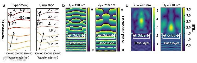 图3. (a) 实验及FDTD模拟光谱, (b) 490 nm及710 nm 波长FDTD近场电场相位, (c) 490 nm及710 nm 波长FDTD近场电场幅值