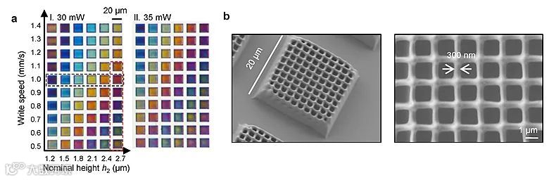图2. (a) 不同激光功率,扫描速度及高度下的结构色光学显微镜图, (b) 打印结构的扫描电子显微镜图