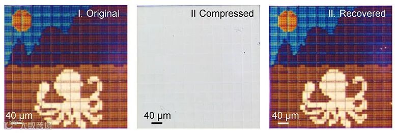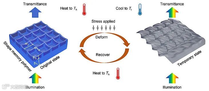 图1. 亚微米尺度形状记忆聚合物4D打印结构及颜色变化示意图