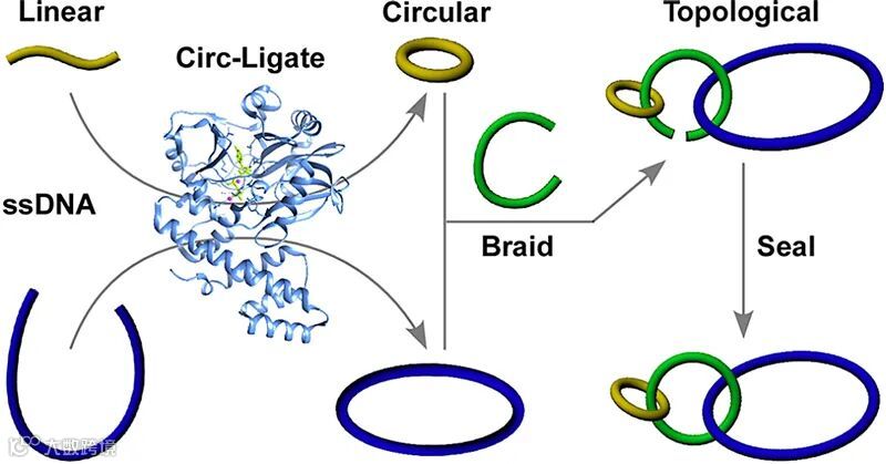 近日,复旦大学顾宏周团队报道了一种基于CircLigase高效制备DNA单环和拓扑结构的新技术。这一技术主要通过在单链DNA末端设计杂交的结构使得CircLigase参与的酶促反应由不可控的熵变主导转为可控的焓变主导,从而高效率(>75%产率)无副产物地合成DNA单环。该技术不仅将CircLigase的催化DNA成环产率稳定地提升至75%以上,而且突破了CircLigase对于可环化的DNA片段的长度的限制,在几百碱基的长链DNA上都得到了验证。课题组同时利用CircLigase预制备的单链DNA环作为起始组装材料获得了高纯度的DNA拓扑嵌套结构。
