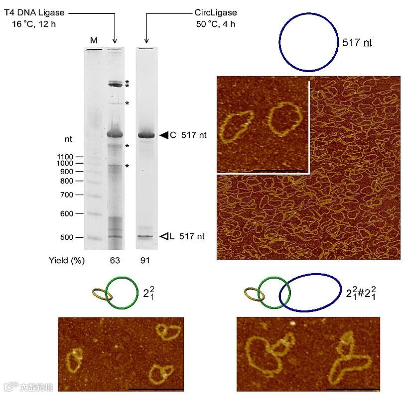 图3. T4 DNA ligase与CircLigase制备单链DNA环对比图及单环与嵌套结构表征图。图片来源: Anal. Chem.