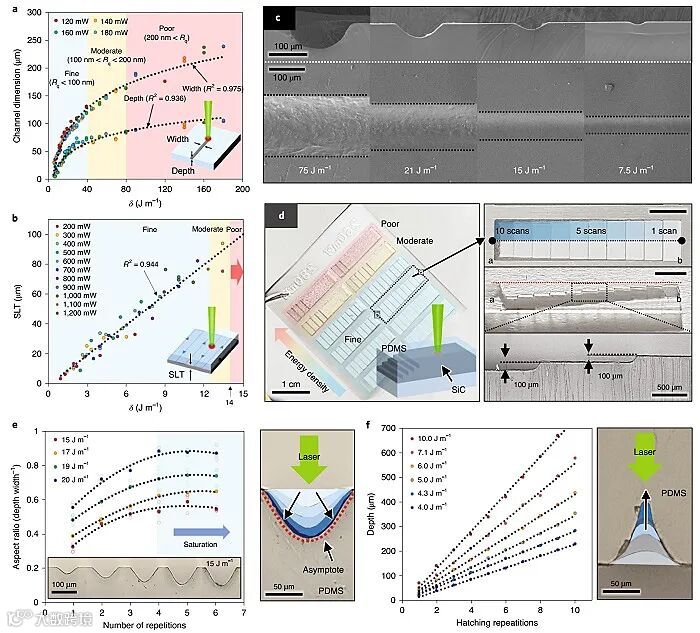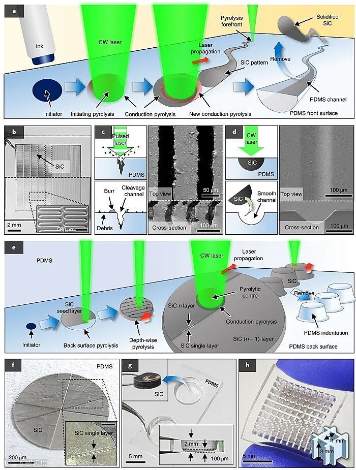 采用连续波(CW)激光辐照,研究团队从PDMS基材表面热解起始点开始形成初始的不透明碳化硅(SiC)层;基于SiC层的吸光度增加,激光的光热能(光热效率)进一步提升,使得激光聚焦的几微米范围PDMS材质热解,最终通过正表面扫描SLP(FSS SLP)技术、沿着激光辐照路线完成PDMS的热解成型加工。