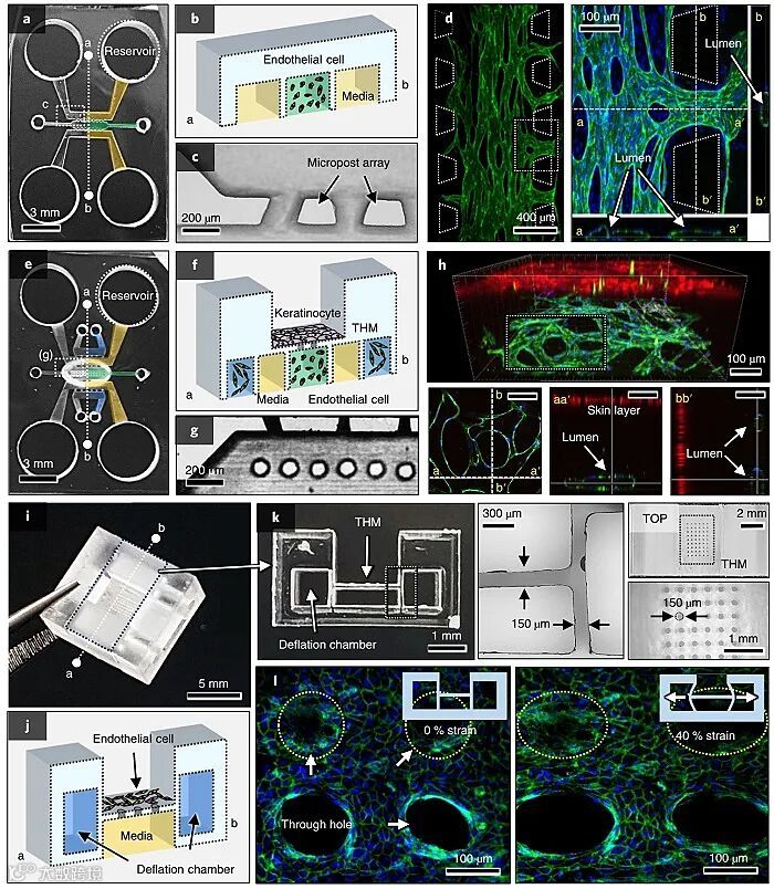 在微纳结构器件构筑应用方面,研究团队运用SLP技术实现了3种代表性PDMS基生物芯片的自动化、快速制备。单通道微血管芯片:采用梯形微柱阵列分隔通道、使培养基实现有效供应,成功实现三维微血管网络的构筑;双层皮肤芯片:由上层用于皮肤细胞的孔结构和下层用于血管网络的空间结构组成,血管网络被嵌入的薄透孔膜(200微米)分隔开;可拉伸膜芯片:具有优异的可逆形变能力。