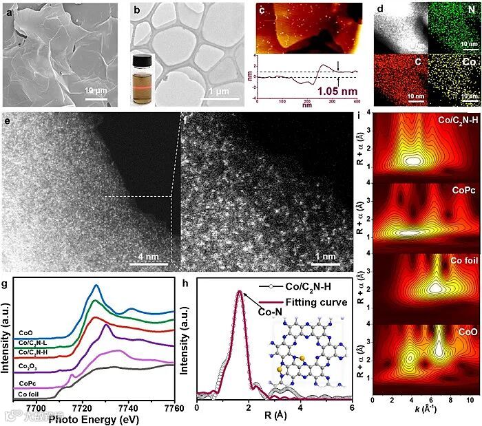 图2. Co/C2N单原子催化剂的结构表征。(a, b, c)SEM,TEM,AFM表征结果;(d,e,f)元素面分布测试图和球差电镜表征结果。(g,h,i)同步辐射X射线吸收谱表征结果。