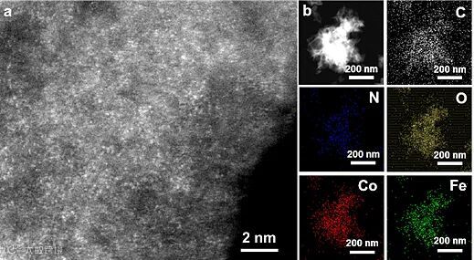 图4. CoFe/C2N催化剂球差电镜测试结果以及元素面分布。