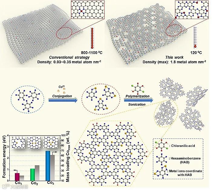近年来,在催化材料领域可控合成配位结构均一稳定的非贵金属单原子催化剂的相关研究备受关注。这主要由于理论上单原子催化能够实现100%原子利用率,同时,清晰的配位结构则有利于实验结果与理论模拟结合,从而探明催化反应机理。传统的单原子催化剂制备手段往往通过高温焙烧手段将金属原子随机锚定在目标载体上。然而,单原子催化剂制备对焙烧温度十分敏感,高温焙烧条件的略微变动容易导致金属原子的烧结并有破坏原有的配位结构。因此,基于高温焙烧前驱体的制备手段而获得的单原子催化剂往往面临着原子结构不可预测,重复率偏低,且金属负载量难以提升等问题。因此,开发新的制备方法来取代高温焙烧手段,实现精确可控制备高负载量单原子催化剂, 仍然是该领域所面临的一个难点问题。