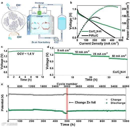 得益于其高活性位点密度,该钴基单原子催化剂表现出了优异的耐久性,以其为空气电极的可充电锌空液流电池持续循环6000次(1000 h)仍保持性能稳定(图3)。