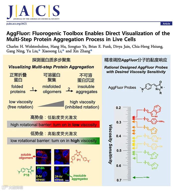 蛋白质变性与聚集被认为会导致多种神经退行性疾病,例如阿尔茨海默症、帕金森综合症、渐冻人症等。蛋白质的错误折叠与聚集是一个多步骤的复杂物理化学变化过程,其中错误折叠蛋白会首先形成可溶性的蛋白聚集,随后进一步发展成为不可溶的蛋白沉淀。不同蛋白质聚集状态的治病机理以及代谢途径不尽相同,而如何区分蛋白聚集的不同状态,一直是领域内的一个技术难题。蛋白质的聚集和沉淀会造成局部微环境的变化,包括空间位阻上升造成的粘度增加。近日,美国宾州州立大学张鑫教授团队在最新发表的J. Am. Chem. Soc.和Angew. Chem. Int. Ed.两篇文章中分别展示了通过不同的化学手段调整荧光探针的粘度响应,从而实现在活体细胞内实现对蛋白质各种聚集状态精准识别的研究。[1-2]