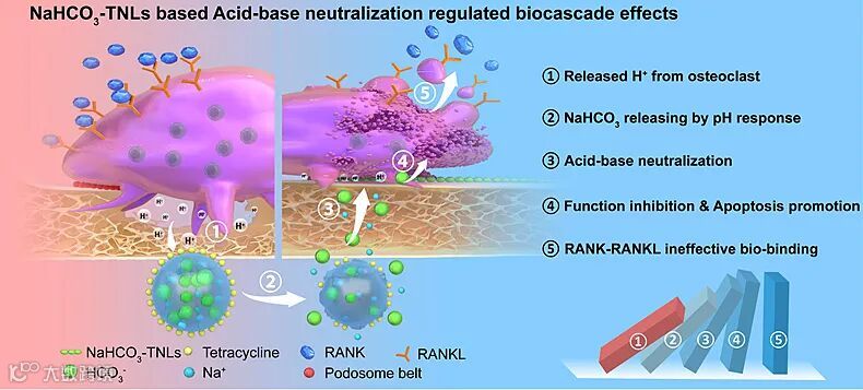 骨质疏松症是一种全球性慢性疾病,其特征是以破骨细胞泌酸异常增强而导致的骨量降低和骨组织的微结构破坏,从而引起骨脆性增加和骨折易感性。据估计,2010年全世界与骨质疏松症密切相关的髋部骨折达到130万例。对于快速老龄化的社会,它仍然是医护人员面临的长期临床挑战。尽管常规抗骨吸收药(双膦酸盐和狄诺塞麦)和骨合成代谢药(特立帕肽和阿巴洛哌肽)已被用于临床治疗,可进一步抑制骨丢失,但一旦发生骨质破坏,这些治疗方法中的大多数不能完全修复破骨细胞过度活化引起的骨破坏。同时,当前用于破骨细胞药物的非选择性的递送通常会导致脱靶和其他脏器副作用,例如非典型股骨骨折、下颌骨坏死、心血管事件等。临床上可用的药物作用主要集中在破骨细胞生物学的角度,而没有特异性的针对其起始酸化的溶骨微环境。因此,需要提出一种简单、精确、智能的治疗策略,以在破骨细胞开始过度酸化时主动保护骨骼免受损害。