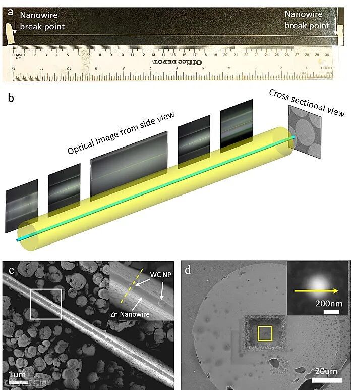 图1. 锌金属纳米线表征结果。(a)相机(b)光学显微镜(c-d)电子显微镜。图片来源:Nat. Commun.