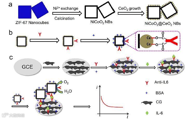 谭月明教授团队以ZIF-67为前驱体,通过离子交换和煅烧得到镍钴双金属氧化物,再利用冷凝回流将二氧化铈纳米粒子负载到双金属氧化物上,制得了NiCoO2@CeO2纳米盒(图1a)。由于NiCoO2和CeO2的协同催化作用,NiCoO2@CeO2在中性介质中具有良好的OER活性。此外,因为CeO2易与抗体的羧基间形成酯键,所以抗体能方便地固定在NiCoO2@CeO2纳米盒表面(图1b)。他们以人白细胞介素6(IL-6)作为模型目标物,以NiCoO2@CeO2纳米盒为标记物,利用NiCoO2@CeO2纳米盒在中性溶液中的OER活性,构建了一种新型电化学免疫传感平台(图1c)。