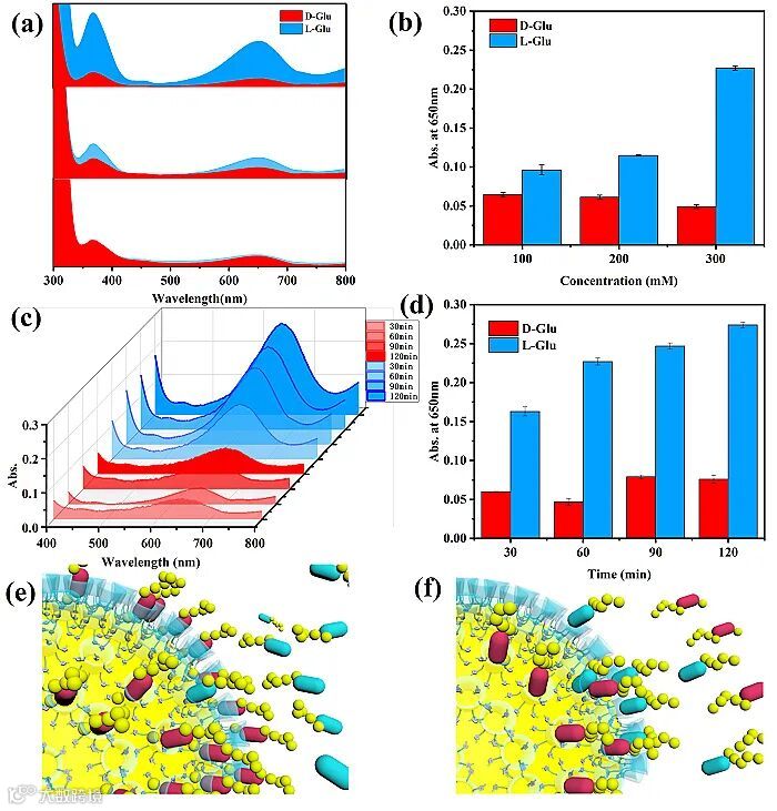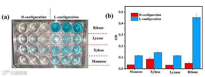 更有趣的是,超分子催化剂还能够作为一种十分特殊的葡萄糖氧化酶,对不同构型的葡萄糖或单糖有着不同催化活性,通过一系列的对照实验和控制实验证实了,这个手性识别催化过程来源于环糊精空腔的手性识别能力以及纳米金表面静电场的共同作用。利用这一特性,结合3,3,5,5 -四甲基联苯胺的特殊显色反应实现了对常见单糖(葡萄糖、甘露糖、核糖、木糖)手性的快速比色识别。