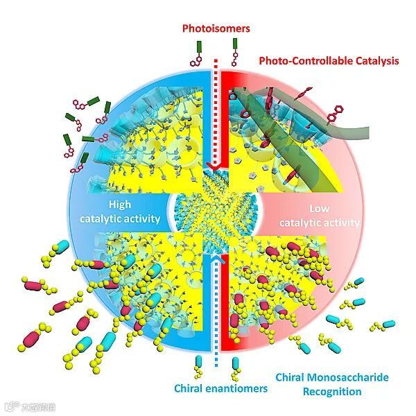 在前期工作的积累下,南开大学刘育教授课题组进一步拓展了环糊精超分子组装体在催化领域地应用。以多聚阳离子环糊精衍生物以及纳米金材料通过超分子组装策略构筑了一种新型的超分子催化剂(AuNP@6-Iz-α-CD),光致异构体(偶氮苯修饰苯丙氨酸二肽Azo-FF)客体分子的引入可以实现对体系催化活性的可逆光刺激响应调控;手性对映异构体(D-, L-单糖)作为底物客体分子,能够诱导手性识别催化过程并成功实现对手性单糖的比色识别。