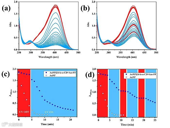 通过静电相互作用环糊精衍生物紧密负载于纳米金表面,成功构筑了超分子催化剂。纳米金表面的环糊精赋予了超分子催化剂对于底物分子识别和选择的能力,光致异构体Azo-FF偶氮苯部分处于反式构型时,能够与环糊精空腔键合,并且苯丙氨酸二肽部分的进一步组装过程导致了催化体系的活性处于休眠状态。得益于Azo-FF对于紫外光的灵敏响应以及高异构化效率,在紫外光的刺激下,空腔当中的偶氮苯部分快速转变为顺式构型,脱离空腔从而唤醒催化体系活性。通过交替切换光照的波长,可以实时地对催化体系的活性进行调控。
