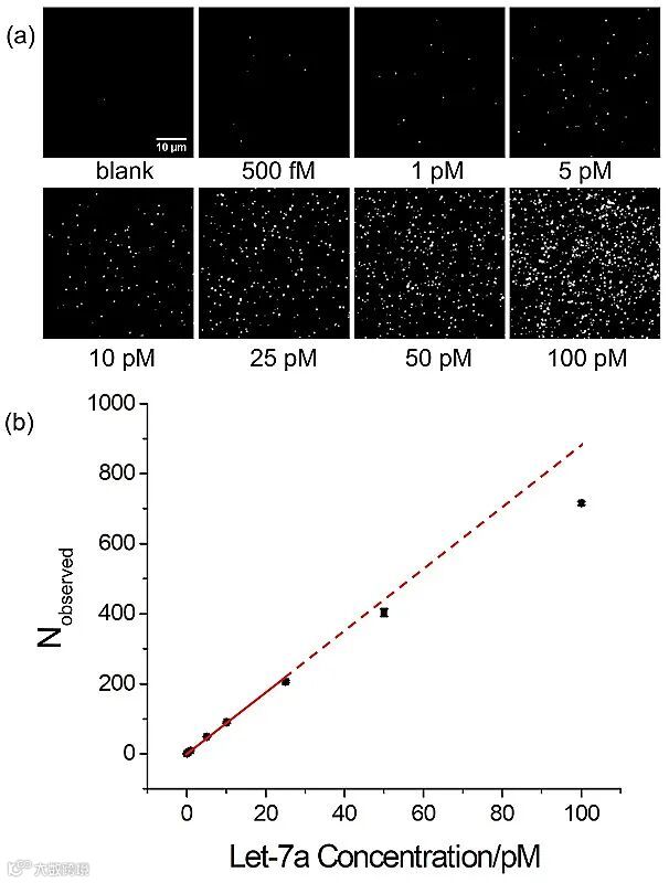 该ddWalker体系通过全内反射荧光显微镜计数荧光阳性纳米颗粒的数量,在遵循泊松分布的情况下,可以精确并数字化地反映初始microRNA的浓度,无需外部校准曲线,就可以对microRNA进行精确定量。同时,这种ddWalker设计具有很高的特异性,通用性,有望广泛应用于生物医学研究中。