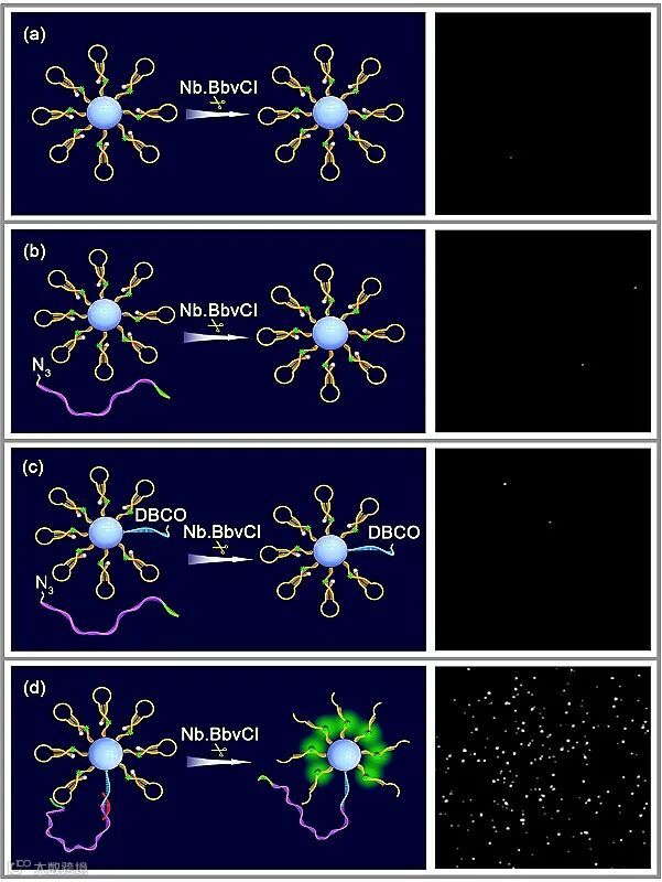 图2. 方法特异性评估。(a)该ddWalker体系中,底物茎环探针的茎部修饰有荧光基团和猝灭基团,荧光信号被完全猝灭,所以底物探针不会引入背景荧光信号;(b)反应体系中游离的自由摆臂探针与底物环部杂交不稳定,不会被切刻内切酶识别并发生酶切反应,因此反应体系中自由摆臂探针的存在不会产生非特异性信号;(c)在该设计中,不存在靶标microRNA时,探针间不会发生非特异性的点击化学核酸连接反应,同样不会产生非特异性信号;(d)只有当摆臂探针通过microRNA介导的点击化学核酸连接反应固定到纳米颗粒载体表面时,由于高度临近效应,摆臂探针才可以与底物探针稳定杂交,切刻内切酶可以识别该杂交序列,并依次切割底物探针环部,实现单颗粒表面高度限域化ddWalker反应,观察到明亮的荧光阳性颗粒。