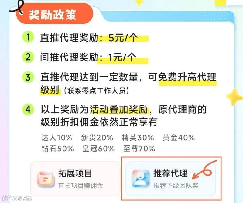 间推代理:你的下级代理再推荐代理,你还能获得1元/人的间推奖励。