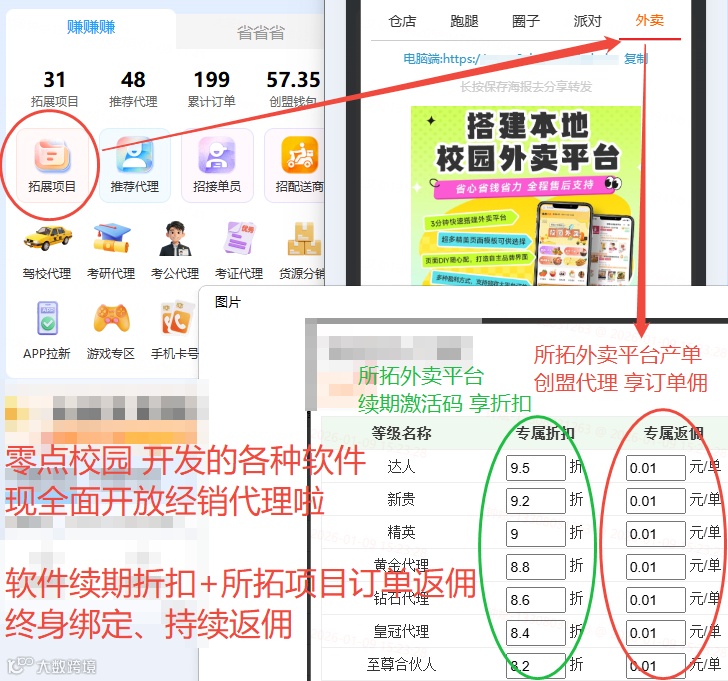 零点创盟采用软件分销+代理推荐的双轨制收益模式,最大特点是“一次绑定,终身收益”。你只需通过分享推广,将校园用户或商家绑定至你的代理名下,后续他们使用系统产生的每一笔订单,你都能获得相应佣金。