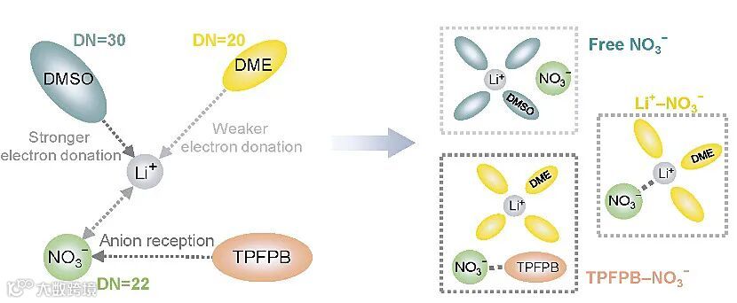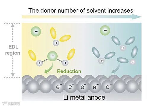 系统的研究结果证明,阴-阳离子间的直接缔合可中和阴离子自身的负电特性,使得阴离子可以接近同样荷负电的金属锂电极表面,从而参与SEI的构建。在强极性溶剂如DMSO体系下,阴-阳离子间的相互作用被严重削弱,导致阴离子无法进入金属锂双电层内分解构筑SEI。