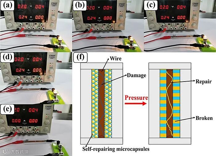 这项研究工作以水溶液为芯材,通过油包水的方式制备得到具有缓释效果的自修复微胶囊,避免了贵金属和酸碱溶液体系在修复过程中存在的问题,具有环境友好、绿色无污染的特点。通过施加压力,即可促使微胶囊破裂释放芯材,实现电子设备电路的修复和功能恢复。未来,将自修复微胶囊与导电油墨、导电浆料进行结合,将会在柔性电子器件或人造电子皮肤等领域发挥巨大的作用。