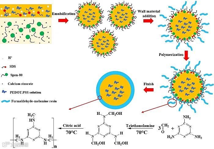 目前常用的电路自修复材料包括贵金属、有机碳材料、酸碱溶液等,上述材料在应用过程中,往往涉及到成本较高、溶剂挥发、设备腐蚀、环境污染等问题,因此,制约了自修复材料的实际应用。微胶囊技术是一种可实现流体固态化的技术,可将功能材料或溶液作为芯材进行包埋,在特定的条件下,实现芯材缓释或完全释放,从而发挥芯材的作用。因此,考虑采用导电水溶液作为芯材,制备一种可用于电路恢复的自修复微胶囊,将会对电子设备性能修复具有重要的意义。通过采用施加压力或升高温度的方法,使微胶囊壁材破裂、芯材释放,从而实现电路导通,同时由于芯材为水溶液体系,具有环境友好、绿色可持续的优点,未来在柔性电子产品的自动修复过程中将会发挥巨大的作用。