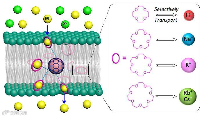 图1. 基于C60-富勒烯核心和冠醚表面修饰的分子球,及其作为人工离子载体而实现的高效且具有可定制选择性的跨膜碱金属离子的定向运输。图片来源:J. Am. Chem. Soc.