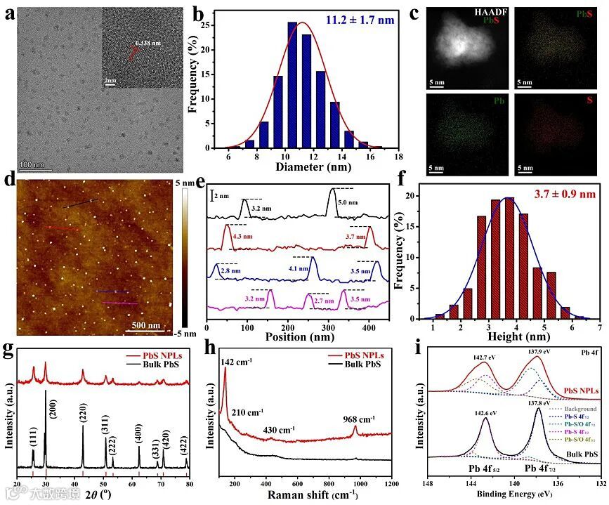 二维硫化铅纳米片作为优异的光学活性材料被广泛应用于光电器件的制备,然而当下制备二维硫化铅的方法主要是自下而上的溶液生长法,得到的纳米片大都在几百纳米甚至几微米尺度,导致材料表面具有较多的缺陷从而限制了该材料的进一步应用。近期,深圳大学张晗教授课题组报道了一种简便的液相剥离法制备超小硫化铅纳米片,如图1所示,该纳米片具有11.2±1.7纳米的横向尺寸和3.7±0.9纳米的厚度。XRD表明液相剥离并没有改变所得材料的晶体结构,而尺寸的减小使得材料表面存在少量的氧化。