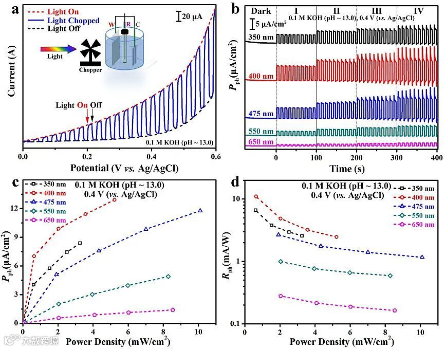 随后作者研究了其瞬态光学性质,并将其用作活性材料制备光电化学型光电探测器的工作电极。如图2所示,所制备的硫化铅纳米片具有明显的光电响应,光电流密度随着光照强度的增加的增大。同时该材料对400纳米的光展现出最明显的响应行为,在0.1 mol/L的氢氧化钾中的光电流密度可达12.89 μA/cm2,响应率为10.97 mA/W。