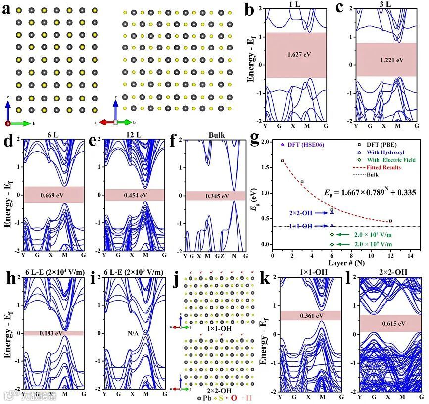 研究表明,测试条件的变化也能够对材料的光电响应性能产生重要的影响,例如降低外置电压能够削弱硫化铅纳米片的相应能力。此外作者还发现该材料在中性电解质中的性能远低于碱性条件,通过DFT计算发现,材料的带隙随着厚度的增加而减小,外加电压的增加能够进一步减小材料的带隙,同时碱性条件下材料的带隙明显要小于中性条件(图3),这些计算结果与实验现象能够很好地吻合。此外,进一步研究表明随着涂层厚度的增加,器件的光电响应性能可以进一步提高。在浓度提高到3.5 mg/mL时,材料的光电流密度可提高至21.96 μA/cm2,响应率升高到27.81 mA/W。通过长时间稳定性测试发现器件在碱性条件下具有非常好的循环稳定性,为其实际应用奠定了基础。