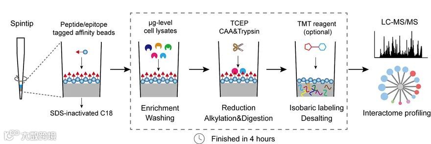 蛋白质是生命活动的实际执行者,解析蛋白质相互作用网络对于深刻理解生命活动过程以及疾病发生发展机理至关重要。亲和纯化-质谱(Affinity purification – mass spectrometry, AP-MS)是一种经典的分析策略,已被广泛应用于解析蛋白复合物的组成以及其动态变化。传统的AP-MS样品前处理流程包括基于多肽探针或者标签抗体的亲和富集、非特异性吸附蛋白的去除、蛋白酶解、洗脱以及除盐。这一过程不仅步骤冗长,而且由于涉及到多步大体积的溶液置换,样品损失较大,因此通常需要数百微克乃至毫克级别的细胞裂解物。灵敏度的限制使得传统的AP-MS工作流程较难应用于样品量较少(如临床样本)或者需要昂贵的长链多肽作为配体时的蛋白相互作用分析实验。
