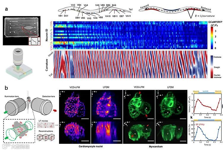 基于此技术,研究者们以100 Hz的体速率对自由运动线虫的神经活动和行为进行了观测。重建的三维图像视频能清晰分辨单个神经元的强度和空间位置的变化。得益于单细胞精度及毫秒级成像速率,研究者成功定量揭示了线虫运动神经元钙信号波动趋势与其行为(速度、行为模式)之间的关系,为线虫神经行为提供了重要参考(图2a)。此外,研究者们还展示了该技术在信号标记更稠密的活体斑马鱼心跳血流成像上的应用(图2b),以200 Hz体速率重建出心肌跳动和血细胞流动的瞬态信号,并完成对应的定量心脏血流动力学分析。