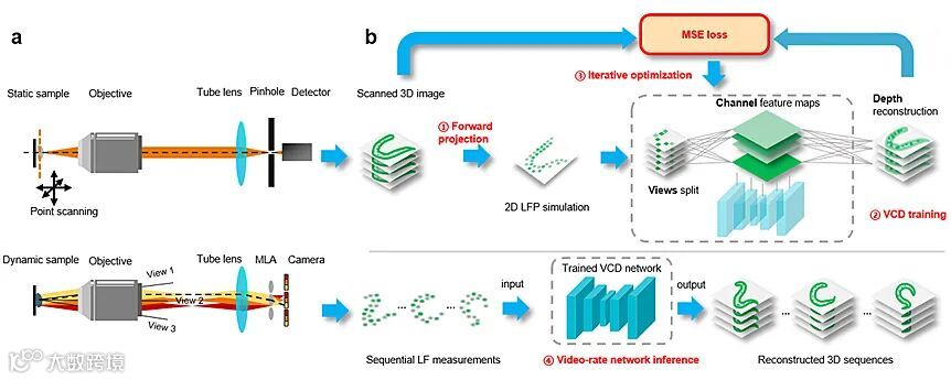 图1展示了光场成像结合深度学习VCD重建的整体工作流程。毫秒级的动态过程由一台自研的光场显微镜获取,原始二维光场图像序列经过一个新颖的“视角提取→特征学习→深度复原”的view→channel→depth重建网络后直接被转变成高分辨率三维图像序列(图1b)。得益于深度学习的标签数据导向特性,该方法不受系统光学衍射的限制,在保持光场成像高时间分辨率的同时,显著提高了三维重建图像的质量。相较于经典的迭代光场去卷积重建算法,速度提高3个数量级,空间分辨率提升2倍,伪影显著地减少。