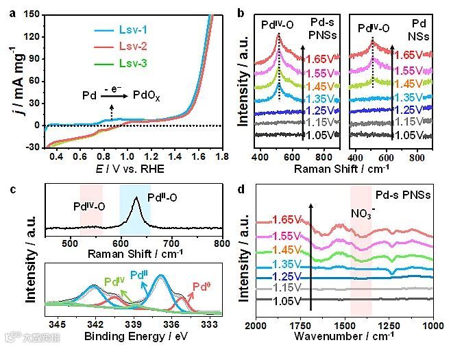 原位拉曼光谱和傅里叶变换红外光谱显示,在实际的催化过程中,Pd会向PdO2发生转化,在PdO2生成后开始有硝酸根的生成。而对于前催化剂Pd纳米片来说,引入拉伸应力后,有助于它向PdO2这一活性相的转化,从而提升了催化性能。这项工作不仅为常温常压条件下的氮气电氧化活性物种提供了基本的理解,而且为设计制备高效电催化材料提供了指导。