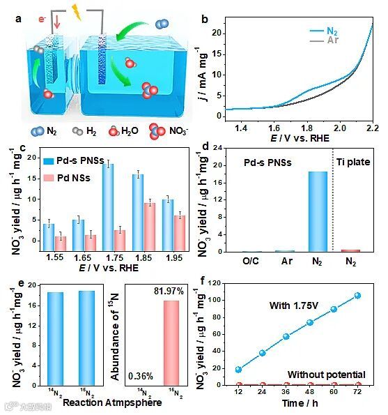 检测结果显示,具有拉伸应的Pd纳米片展现出更高的硝酸盐产率和法拉第效率。并且,一系列的对照实验和15N同位素标记实验证明,所获得的硝酸盐中的氮来源于氮气的氧化。