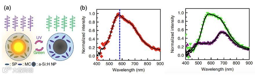 图2.(a)氢化非晶硅纳米颗粒和螺吡喃分子光致变色壳构成的超原子示意图分子。(b)光可调谐超原子的散射光谱。左图:暴露于光线前。右图:暴露于紫外线后灯(紫色三角形)和暴露于绿光后(绿色三角形)。垂直的蓝色虚线指示部花青分子的吸收峰。黑色曲线是平滑处理后的光谱曲线。图片来源:Nat. Commun.