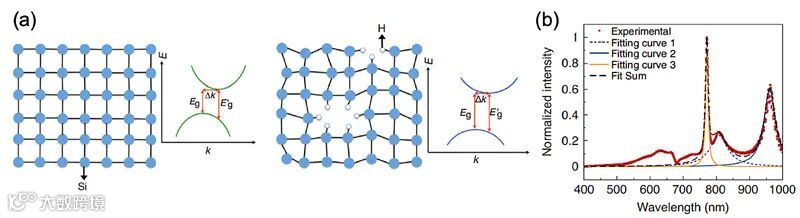 图1.(a)低损耗氢化非晶硅纳米颗粒的带隙工程的图示。左图:纯晶体硅。右图:氢化非晶硅。(b)单个氢化非晶硅纳米颗粒(含10%重量比的氢)的散射光谱。红色虚线和黑色虚线分别是实验数据和拟合光谱。红色虚线,绿色虚线和蓝色曲线分别是拟合曲线1、2和3。图片来源:Nat. Commun.