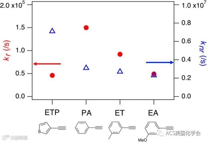 图3. 不同炔基配体保护的Au22团簇辐射与非辐射跃迁速率对比图。
