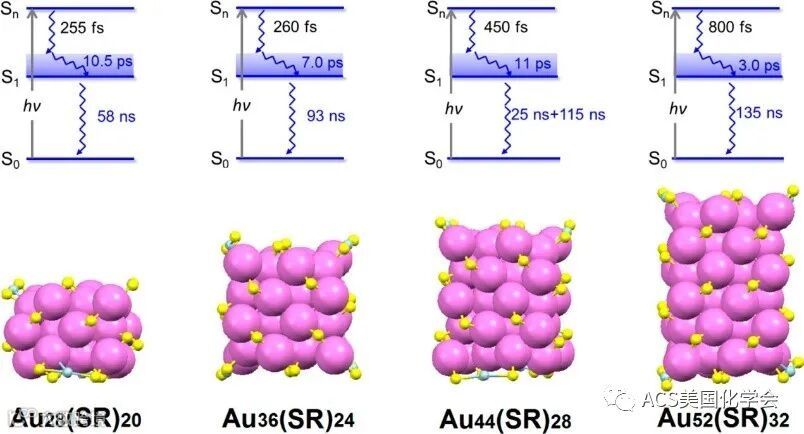 图1. 四种面心立方结构纳米金团簇的激发态弛豫过程示意图。
