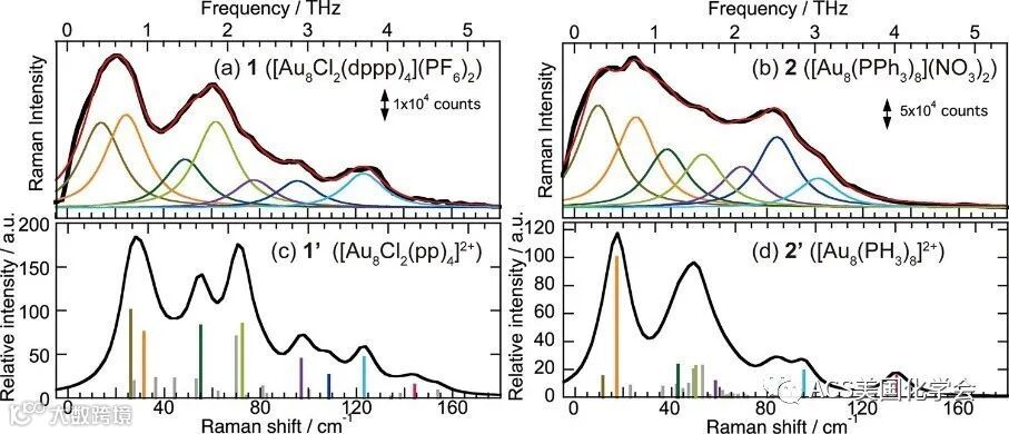 图6. 两种Au8团簇的实验太赫兹拉曼光谱(上)与理论计算结果(下)。