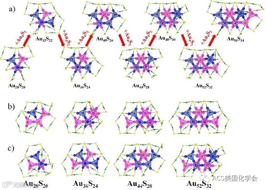 图4. (a)金团簇通过增加Au4单元的生长模式图;(b,c) 8种新预测的同分异构的团簇结构。