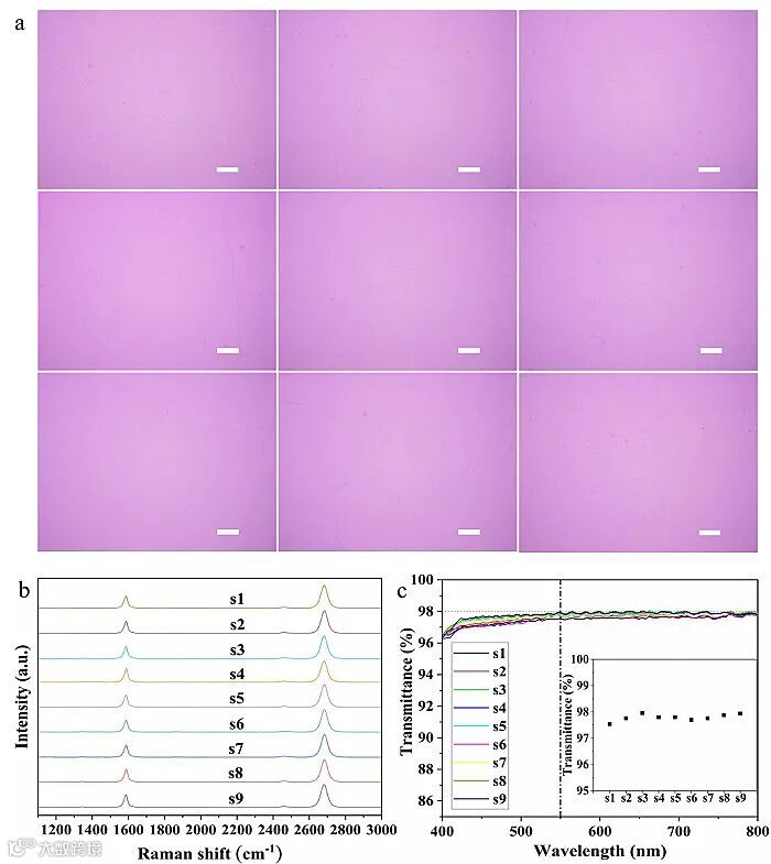 图2. 制备的石墨烯的光学显微、拉曼光谱及透光率的表征结果,显示高质量且均匀的石墨烯薄膜。图片来源:Chem. Eng. J.